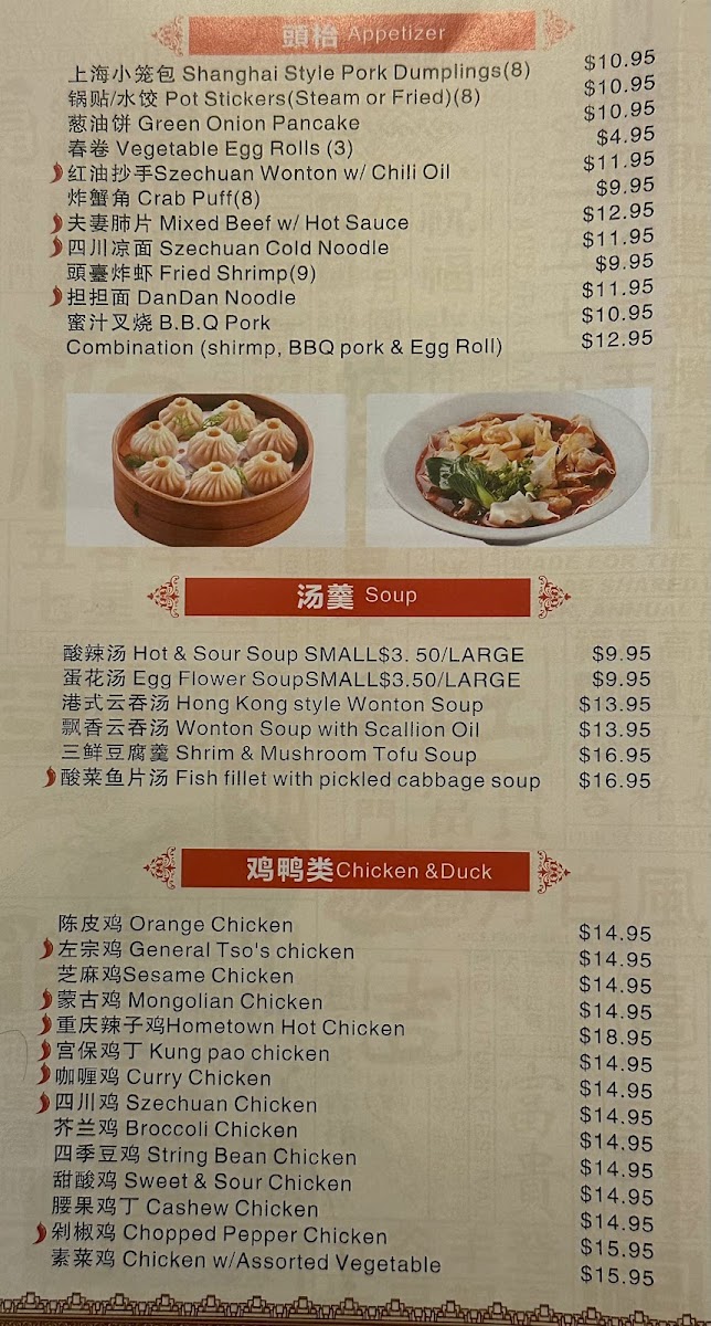 Soups include a variety of options ranging from classic Hot & Sour Soup and Egg Flower Soup to specialized selections such as Hong Kong Style Wonton Soup and Fish Fillet with Pickled Cabbage Soup, covering both mild and spicy preferences.
